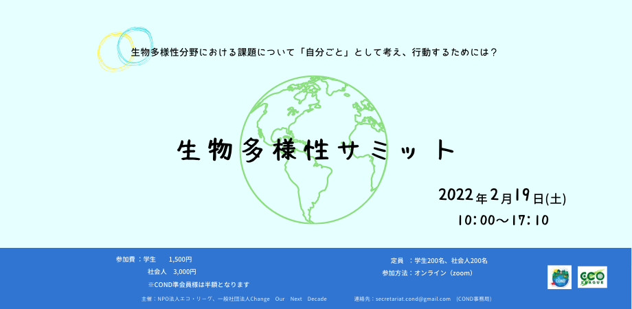 2019年8月に任意団体として設立し、2021年8月に一般社団法人となりました。「人と自然がより良く共生する社会を実現する」ことをビジョンに掲げ、30歳以下の北海道から九州までの若者が10名程度で活動を行っています。主な事業として、国際・国内の生物多様性に関する政策への提言や、生物多様性の主流化の促進を目指し、若者及び将来世代の自然環境保全に関する能力養成・参画支援等を実施しています。