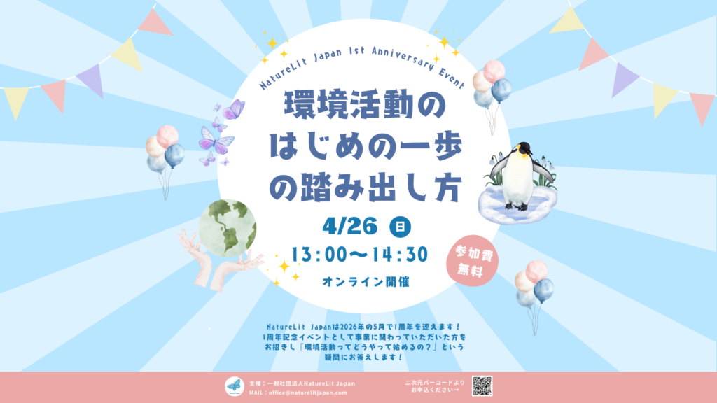 メディア記事や生物多様性の日のイベント、Green Future Makersなど、NatureLit Japanの事業を一緒に進めてきた方をお招きし、発表やパネルディスカッションを通して、「環境活動ってどうやって始めるの?」という疑問にお答えするオンラインイベントです!